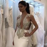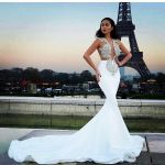 Column Scoop Neck Court Train Satin Evening Dress With Crystal