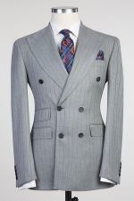 Grey Striped Double Breasted Peaked Lapel Business Men Suit