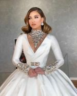 Ball Gown High Neck Court Train Satin Wedding Gown With Crystal