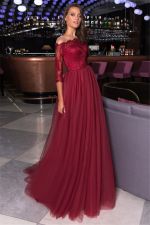 A-line Bateau Neck 3/4-Length Sleeves Floor-length Tulle Evening Dress With Lace
