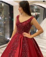 A-line V-neck Sleeveless Court Train Satin Wedding Gown With Lace
