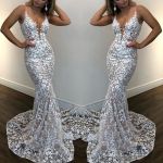 Column V-neck Sleeveless Sweep / Brush Train Lace Formal Dress With Lace