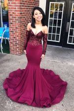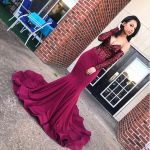 Mermaid V-neck Long Sleeves Sweep / Brush Train Satin Evening Dress With Appliques