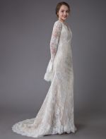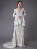 Column Plunging Neckline Long Sleeves Court Train Lace Bridal Dress With Lace